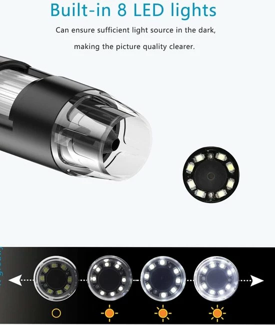 - 【Hoge kwaliteit 8 LED-lampen】 Zorg voor uitstekende details en optimale helderheid en maakt het mogelijk om foto’s of video’s in het bos en sommige donkere plaatsen vast te leggen. Ingebouwde 8 LED-lampen en instelbare verlichting, 50X tot 1600X biedt u een prachtige ervaring van het opnemen van een heldere microwereld.