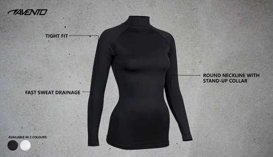 Avento baselayer shirt voor vrouwen met lange mouwen voor extra goede bescherming tegen de kou. Zodra je van plan bent om buiten actief te zijn terwijl het koud is, biedt een base layer extra comfort en bescherming. De Avento basislaag is zo gemaakt dat hij strak om de huid zit en het zweet snel opneemt en doorgeeft – hierdoor koelt je huid minder snel af en blijf jij beter op temperatuur. Door het gebruik van een sneldrogende materiaal in combinatie met lange mouwen en platte naden voelt deze Avento Base Layer aan als een tweede huid. De ronde hals met hoge nek zorgt ervoor dat je geen last hebt van tocht of de ritsen van je (ski)pulli of fleecetrui. Deze thermokleding is dus uitermate geschikt voor sportieve activiteiten in koude weersomstandigheden.