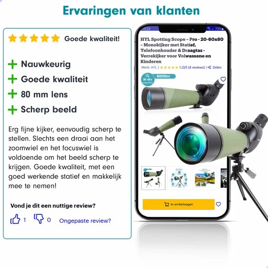 - Optimaal kijkplezier & gemak – Met de professionele statief bedien je jouw spotting scope eenvoudig en spot je jouw favoriete vogel vanuit iedere hoek! Daarnaast ontvang je ook een luxe telefoonhouder hiermee leg je jouw perfecte plaatje simpel vast en deel je in een klik met je vrienden! Tip: gebruik de zoomfunctie van je telefoon om tot wel 60x in te zoomen!