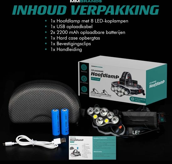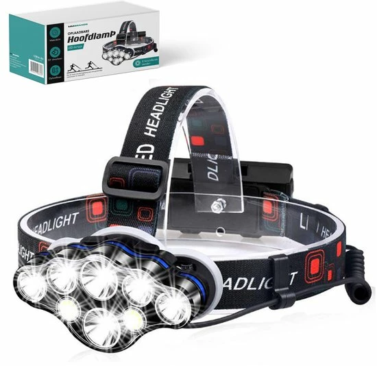 Kies voor verschillende gebruikersdoelen de ideale lichtsetting en geniet altijd van voldoende licht met de MM Brands Hoofdlamp. De 8 ultra sterke 1800 lumen led-lampen schijnen tot wel 600 meter vooruit en zijn verstelbaar in 8 standen.