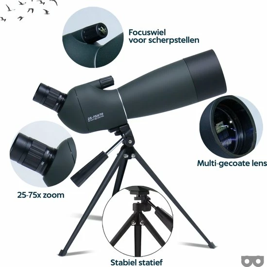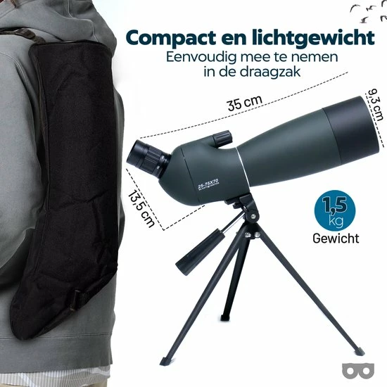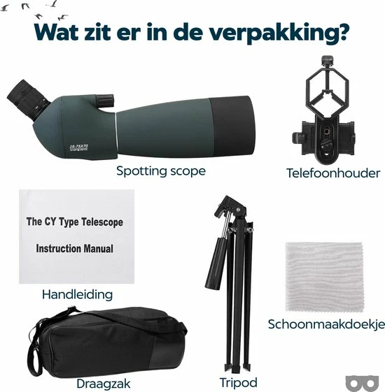 - Inhoud verpakking: 1x Spotting scope, 1x draagzak, 1x tripod,1x telefoon houder, 1x handleiding